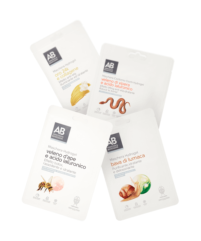 Trattamenti realizzati con uno speciale materiale gelatinoso che aderisce perfettamente, favorendo il rilascio e l'assorbimento dei principi attivi. Per contrastare i segni del tempo, hai a disposizione diverse opzioni, grazie alle quali scoprirai che anche i veleni hanno un lato positivo. Potrai infatti scegliere una maschera illuminante con oro e collagene, ma anche, tra i prodotti con acido ialuronico, quella idratante con effetto lifting a base di veleno di vipera o quella effetto botox con veleno d’ape. Non mancano poi le opzioni per pelli più giovani, come la maschera purificante alla bava di lumaca.