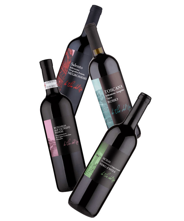 Dall’Oltrepò pavese alla Toscana, passando per il Salento e la Sicilia, nella linea dei vini rossi Le Vie dell’Uva è rappresentata tutta l’Italia, con il suo sapiente patrimonio vitivinicolo storico. I prodotti di questa linea sono tutti rigorosamente Doc e Igt, legati quindi a doppio filo ai loro territori d’origine, dal quale hanno assorbito le caratteristiche: la luce del sole che ha illuminato le vigne, le piogge che le hanno bagnate e i minerali che la terra di ciascun luogo ha generosamente saputo offrire
